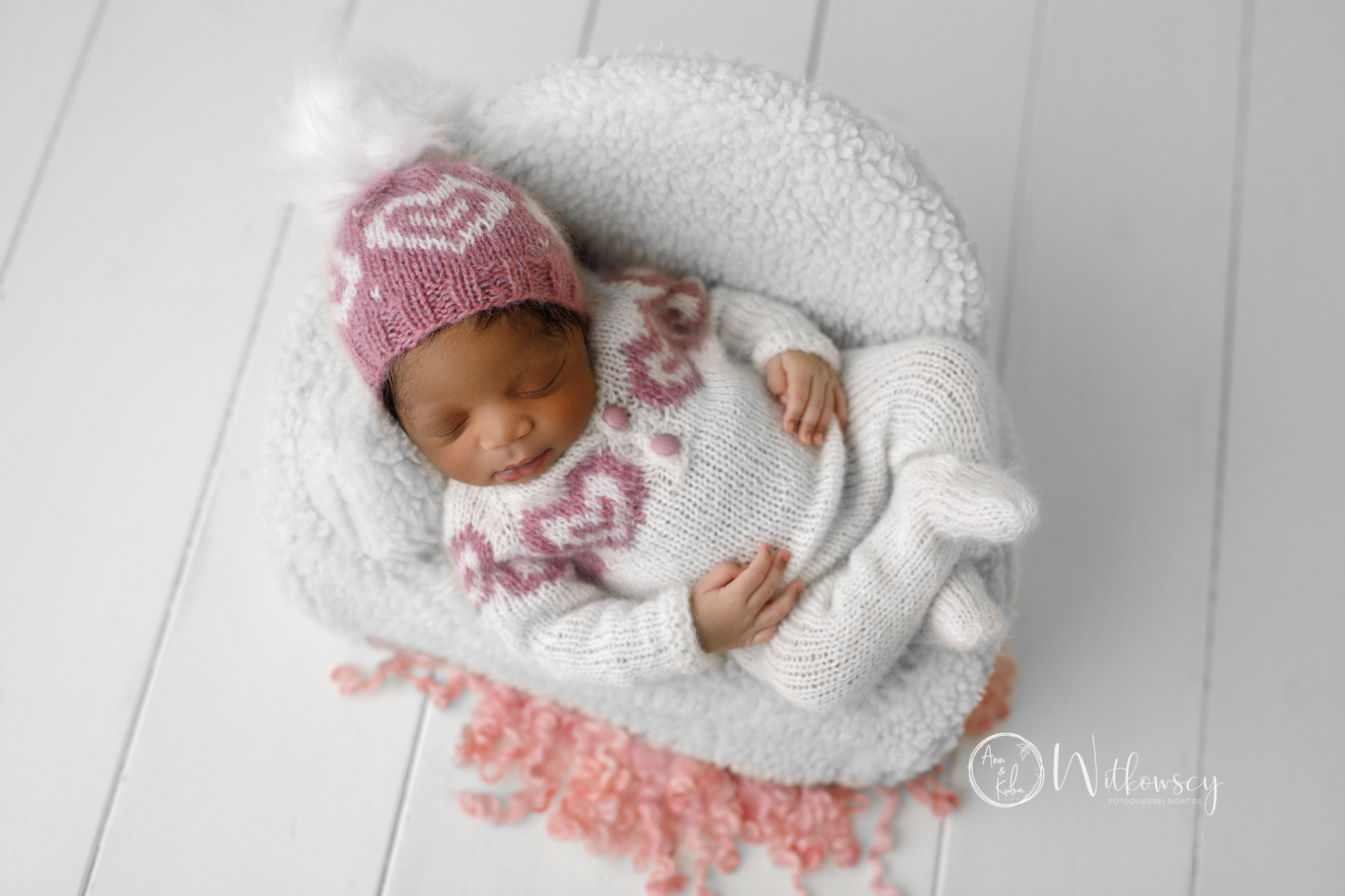 Ein ivory Strampler mit süßem altrosa Herzmuster und dazu eine passende Mütze in Altrosa mit Bommel